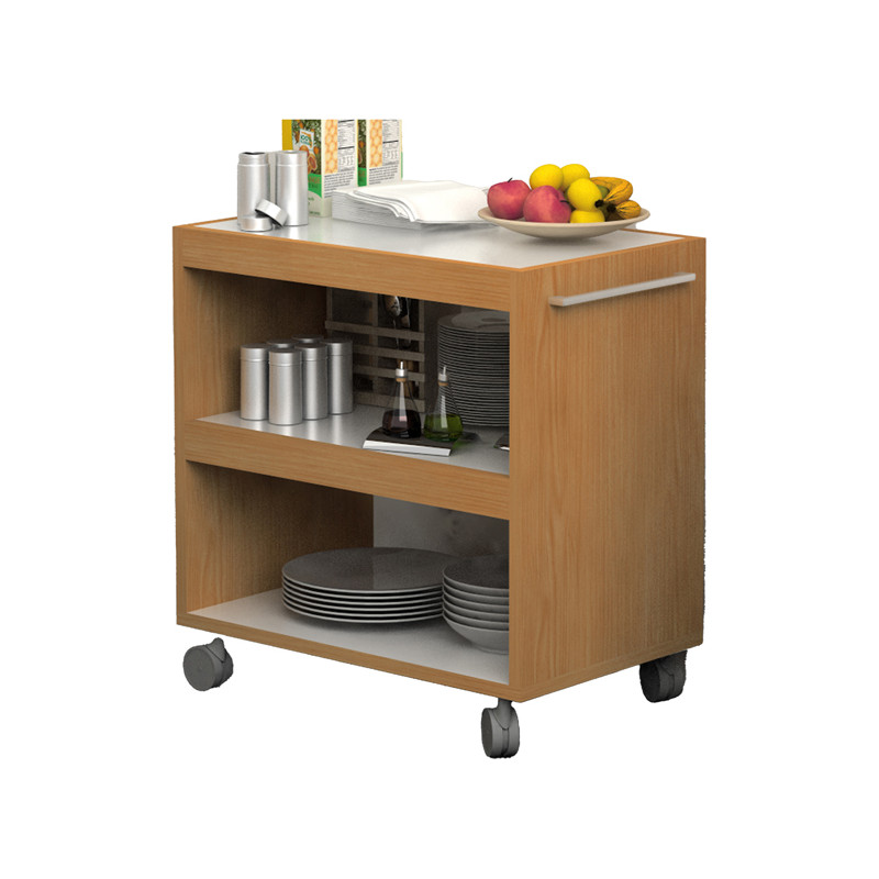 Angolo Ristoro: Set di mobili adatti ad arredare in modo efficacie una piccola zona caffè o ristoro all'interno di aziende, negozi, SPA ecc. In materiale bilaminato nobilitato melaminico conforme alle norme UNI EN classe E1. Antigraffio e antiriflesso. Carrello con 4 ruote pivottanti di cui 2 con freno, ripiano centrale e maniglie su entrambi i lati stretti. Bicolore bianco/noce chiaro. Dimensioni: 70x43,8cm - H73cm