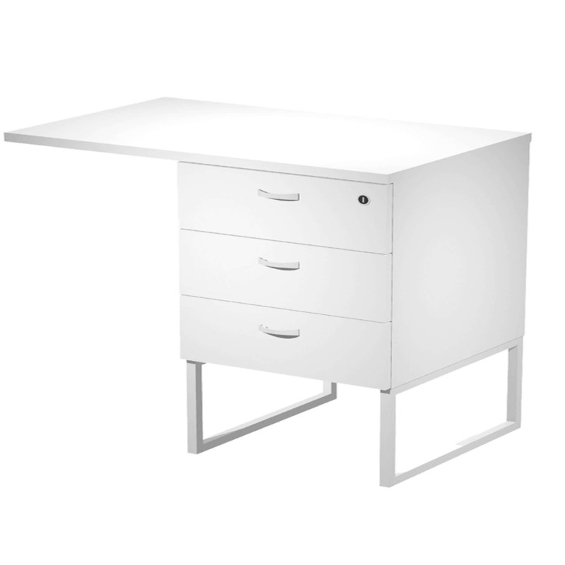 Cassettiera a 3 cassetti con serratura sul primo cassetto, guide metalliche con fermo a fine corsa, fornita montata. Con supporto metal e top,utile per realizzare un allungo laterale destro o sinistro, posizionabile sia parallelamente che perpendicolarmente. Dimensione: 80x50/50X80xH74,4cm.
