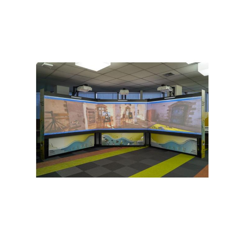 IMMERGITI NEI CONTENUTI E CREA LEZIONI CON UN FORTE IMPATTO EMOTIVO Immersive Teaching System è uno strumento immersivo e interattivo che permette di comunicare attraverso il coinvolgimento multisensoriale alzando la soglia d’attenzione.  a grande superfice di visualizzazione consente di proiettare contemporaneamente alla lezione anche contenuti per ragazzi con bisogni educativi speciali. Si adatta a qualsiasi ambiente I tre schermi che compongono la soluzione possono essere posizionati con angolazioni diverse a seconda delle dimensioni della stanza nella quale Immersive Teaching System viene installato, adattandosi così perfettamente alle necessità della scuola. Interattività con le penne e con le dita