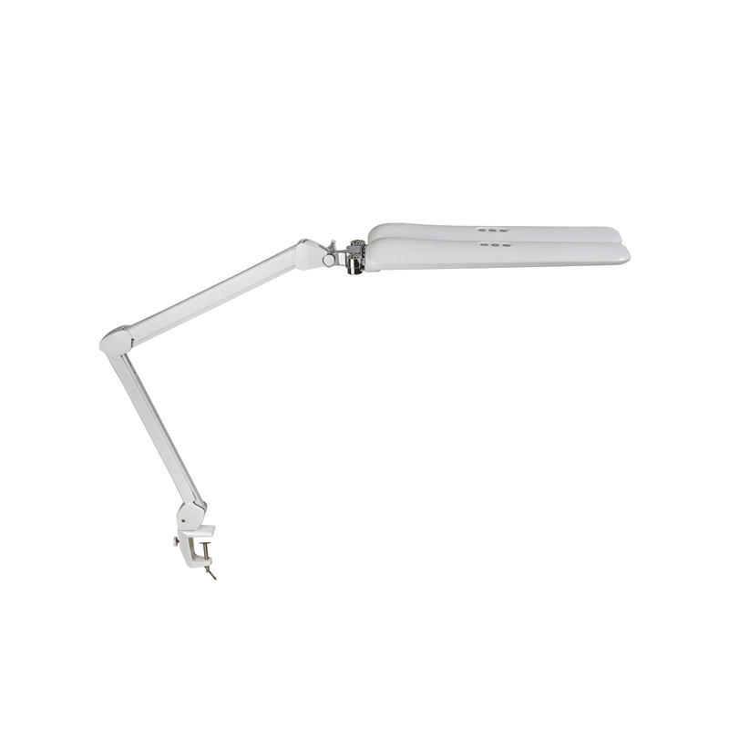 Lampada a LED con due teste di lampada e morsetto da tavolo. Bianco con superficie lucida è dotata di due teste di lampada, che insieme producono un elevato illuminamento. Il pratico morsetto da tavolo consente di fissare MAULcraft duo a tavoli e scaffali. L'intervallo di serraggio è di 1-6,3 cm. Il robusto braccio metallico con molla interna e le due teste della lampada possono essere ruotati e inclinati. Le teste possono essere regolate con un angolo compreso tra 0° e 180°. Con un'impostazione angolare di 180°, la postazione di lavoro può essere illuminata fino a un metro di distanza. Dimmerabile tramite campo touch sulle due teste. Luce bianco freddo 6500K, 2 lampadine da 11W led, flusso luminoso 2 x 1721 lumen. Altezza 52cm, lunghezza cavo 1,7mt.