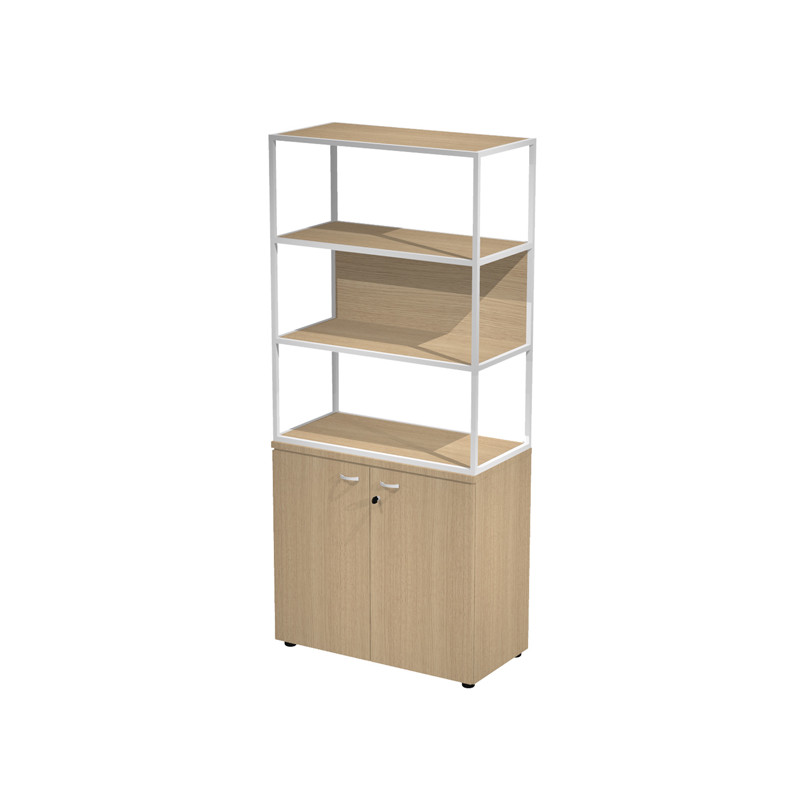 Libreria in metallo a 3 vani con struttura 20x20 mm a giorno con ripiani, base, cappello e un dietro in melaminico , sovrapposta ad un armadio basso, completo di ante battenti con serratura. Libreria metal completa di 1 dietro in melaminico posizionabile a scelta in fase di montaggio. Dimensioni: 90x46xH204cm