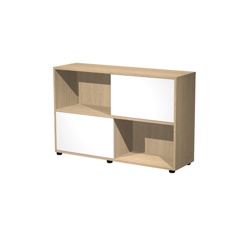 Libreria bassa a 2 ripiani con 2 ante scorrevoli. Struttura e ante in truciolare nobilitato melaminico antigraffio ed antiriflesso spessore 18 mm. Piedini regolabili.