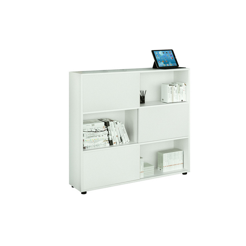 Libreria bassa a 3 ripiani con 3 ante scorrevoli. Struttura e ante in truciolare nobilitato melaminico antigraffio ed antiriflesso spessore 18 mm. Piedini regolabili.