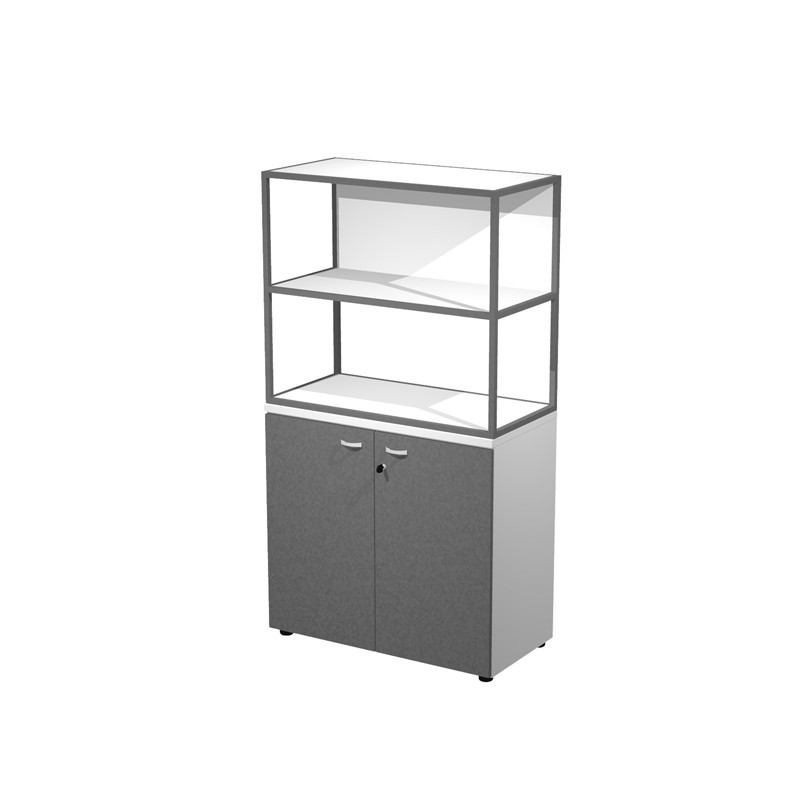 Libreria in metallo a 2 vani con struttura 20x20 mm a giorno con ripiani, base, cappello e un dietro in melaminico , sovrapposta ad un armadio basso, completo di ante battenti con serratura. Libreria metal completa di 1 dietro in melaminico posizionabile a scelta in fase di montaggio. Dimensioni: 90x46xH165cm