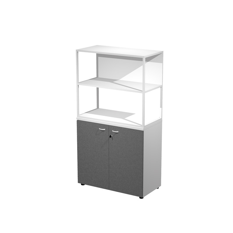 Libreria in metallo a 2 vani con struttura 20x20 mm a giorno con ripiani, base, cappello e un dietro in melaminico , sovrapposta ad un armadio basso, completo di ante battenti con serratura. Libreria metal completa di 1 dietro in melaminico posizionabile a scelta in fase di montaggio. Dimensioni: 90x46xH165cm
