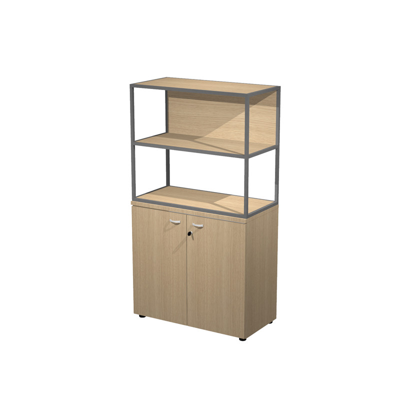 Libreria in metallo a 2 vani con struttura 20x20 mm a giorno con ripiani, base, cappello e un dietro in melaminico , sovrapposta ad un armadio basso, completo di ante battenti con serratura. Libreria metal completa di 1 dietro in melaminico posizionabile a scelta in fase di montaggio. Dimensioni: 90x46xH165cm