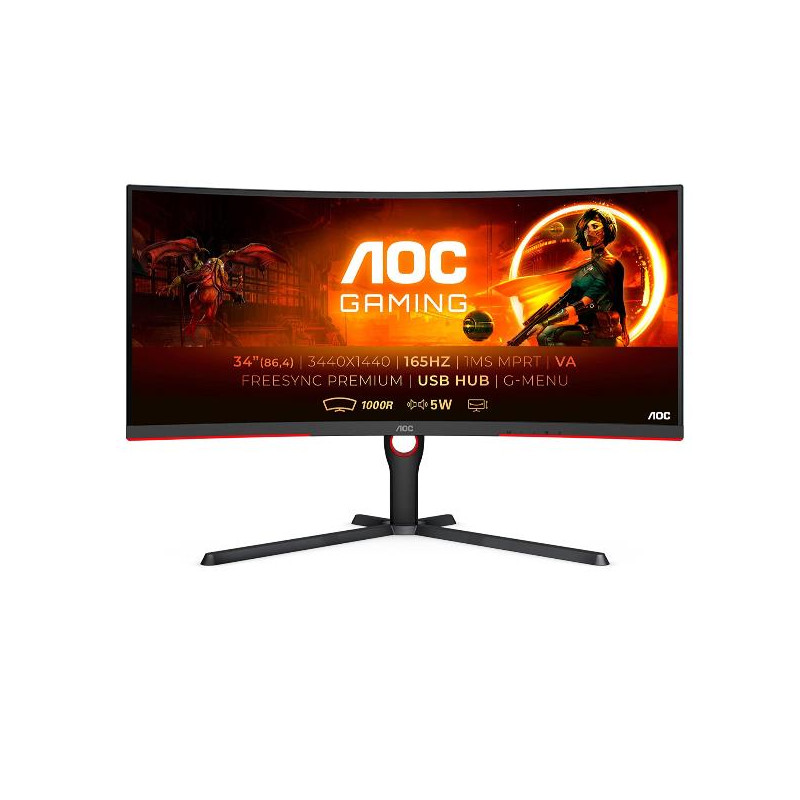 Il CU34G3S/BK è il modello più ampio della nostra linea G3 e offre la tecnologia WQHD (Wide Quad High Definition). Questo monitor da gaming ha una curvatura di 1000R, FreeSync Premium e una frequenza di aggiornamento di 165 Hz.