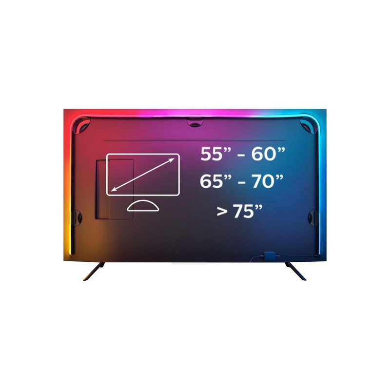 Prova l'emozione del teatro a casa tua con la Philips Hue Play Gradient lightstrip. Ottieni più colori di luce che reagiscono al contenuto sullo schermo. Montala su TV da 75" o più grandi montate a parete o poggiate sugli appositi supporti inclusi.
