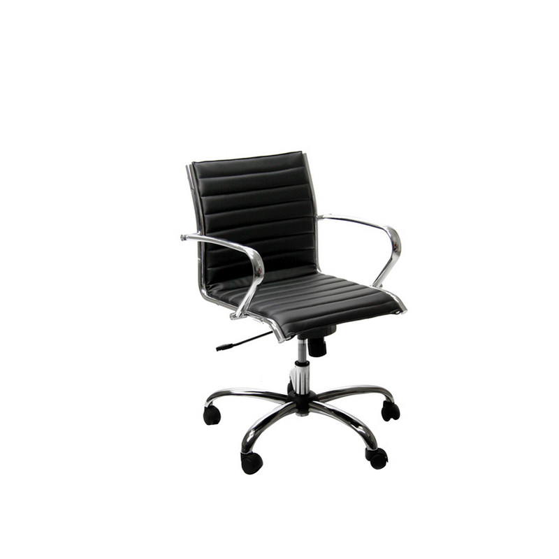 Poltrona con rete portante rivestita in pelle e trapuntata. Schienale medio e base in acciaio. Meccanismo oscillante con fulcro avanzato. Braccioli in acciaio cromato e elevazione a gas.