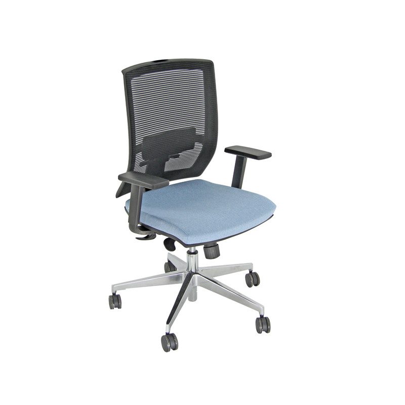 contatto permanente - supporto lombare regolabile up down - base alluminio pressofuso; Rivestimento seduta in tessuto "SUPER - King L" 100% TREVIRA reazione al fuoco classe 1. Completa di braccioli regolabili. Alt.tot.: 103-114cm; Prof.tot.: 70cm; Alt.schienale: 59cm; Larg.schienale: 48cm; Larg.seduta: 47cm; Prof.Sedile: 47cm; Altezza sedile: 43 - 54cm.
