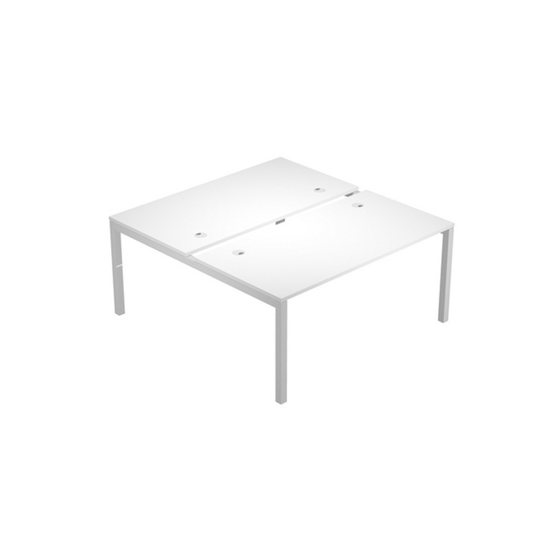 Scrivania a 2 postazioni contrapposte dimensioni L120 x P166 x H74,6cm (ogni postagione 120x80cm). Le scrivanie per postazione singola o multipla, sono in bilaminato nobilitato melaminico conforme alle norme UNI e EN classe E1, antigraffio ed antiriflesso, hanno sp. 25 mm con bordo sp. 2 mm in ABS resistente agli urti. Sono caratterizzate da robuste gambe a ponte in metallo a sezione quadrata (50 x 50 mm) verniciate a polveri epossidiche nel colore grigio alluminio, complete di piedini regolabili in altezza.