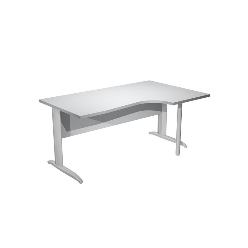 Scrivania compact destro sagomata con fianchi metal ad L verniciati effetto cromato. Spessore 22mm. Completi di canalina passacavi e piedini regolabili in altezza e supporto metal. Desktop con bordo anti urto in ABS da 2mm. Dimensioni: 160x60/80/100x72cm. Piano grigio.
