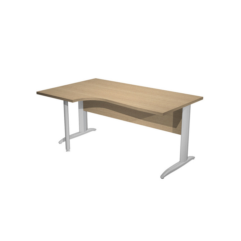 Scrivania compact sinistro sagomata con fianchi metal ad L verniciati effetto cromato. Spessore 22mm. Completi di canalina passacavi e piedini regolabili in altezza e supporto metal. Desktop con bordo anti urto in ABS da 2mm. Dimensioni: 160x60/80/100x72cm. Piano rovere.