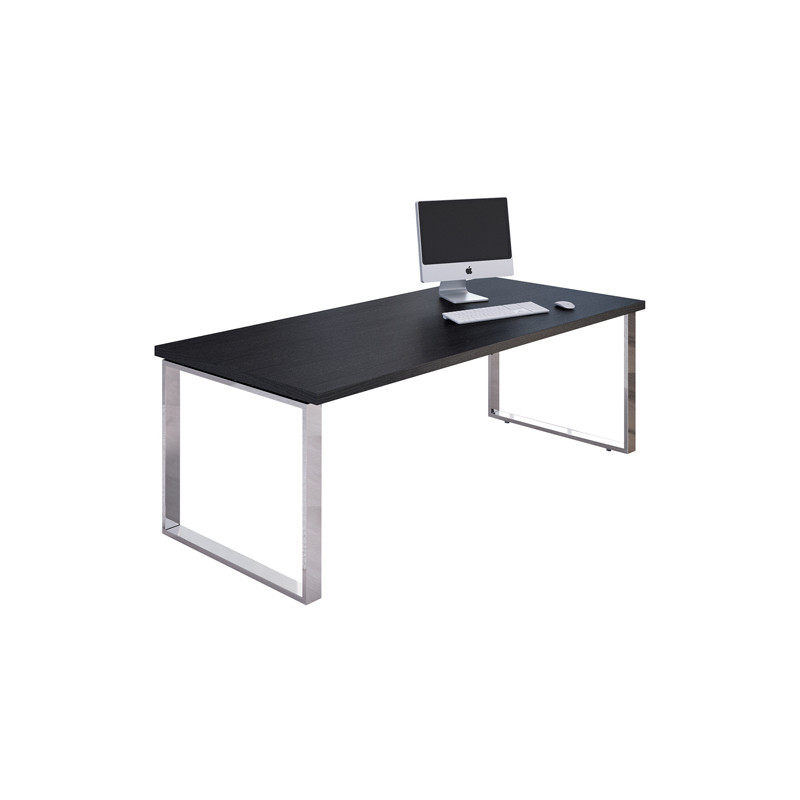 Scrivania direzionale con fianchi in metallo verniciato effetto cromo (70x20mm) completi di piedini regolabili in altezza. Due traverse metalliche per la massima affidabilità e robustezza. Piano (sp. 38mm) con bordo antiurto in ABS (sp. 2 mm). Dimensione:210x90cm - H74cm.