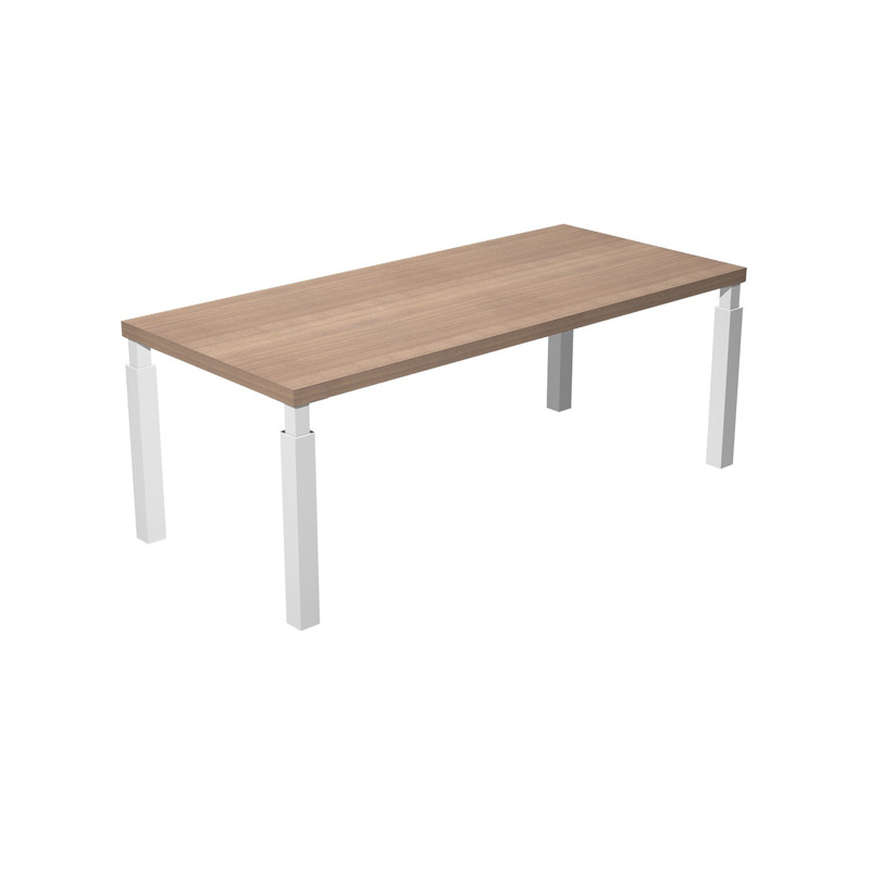 Scrivania direzionale con quattro gambe in metallo a sezione quadrata complete di piedini regolabili in altezza per un perfetto livellamento. Le gambe hanno sezione 70x70mm sul fusto e 40x40 mm nella parte alta e si agganciano al desktop ognuna con una robusta piastra metallica. Desktop (sp. 38 mm) con bordo antiurto in ABS (sp. 2mm). Le gambe, in entrambe le versioni di colore, sono impreziosite da dettagli e particolari cromati.