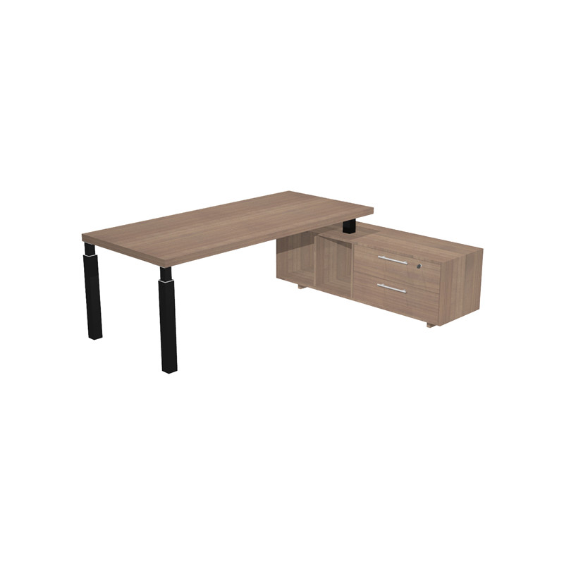 Postazione di lavoro composta da un piano sorretto da un mobile di servizio portante (reversibile destro o sinistro) e da una coppia di gambe in metallo a sezione quadrata complete di piedini regolabili in altezza. Le gambe hanno sezione 70x70 mm sul fusto e 40x40 mm nella parte alta e si agganciano al desktop ognuna con una robusta piastra metallica. Desktop (sp. 38 mm) con bordo antiurto in ABS (sp. 3 mm). Mobile di servizio: struttura sp. 18 mm, due vani a giorno (cm 37,7 x 42,4 x 48h), due ampi cassetti (dimensioni utili in cm 72 x 37,5 x 17h) scorrevoli su guide metalliche con fermo a fine corsa. Robuste ed eleganti maniglie in metallo. Primo cassetto completo di serratura. Le gambe, in entrambe le versioni di colore, sono impreziosite da dettagli e particolari cromati. Ingombro totale: 225x170x76,2Hcm Scrivania: 210x90x74Hcm Mob. servente: 160x50x54Hcm Gambe nero opaco