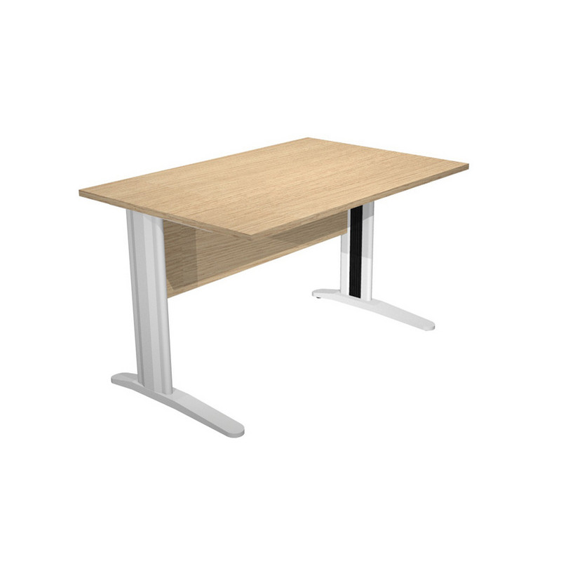 Scrivanie con dimensioni conformi alle normative sulla sicurezza dei posti di lavoro in ufficio. Bordatura dei piani in ABS 2mm antishock ed assenza di spigoli vivi. Le scrivanie sono disponibili nella versione con fianchi pannello in melaminico (sp. 22 mm) o con fianchi in metallo ad L verniciati effetto cromo completi di piedini regolabili in altezza e canalina passacavi ispezionabile. Dimensioni: L120 x P80 x H72cm