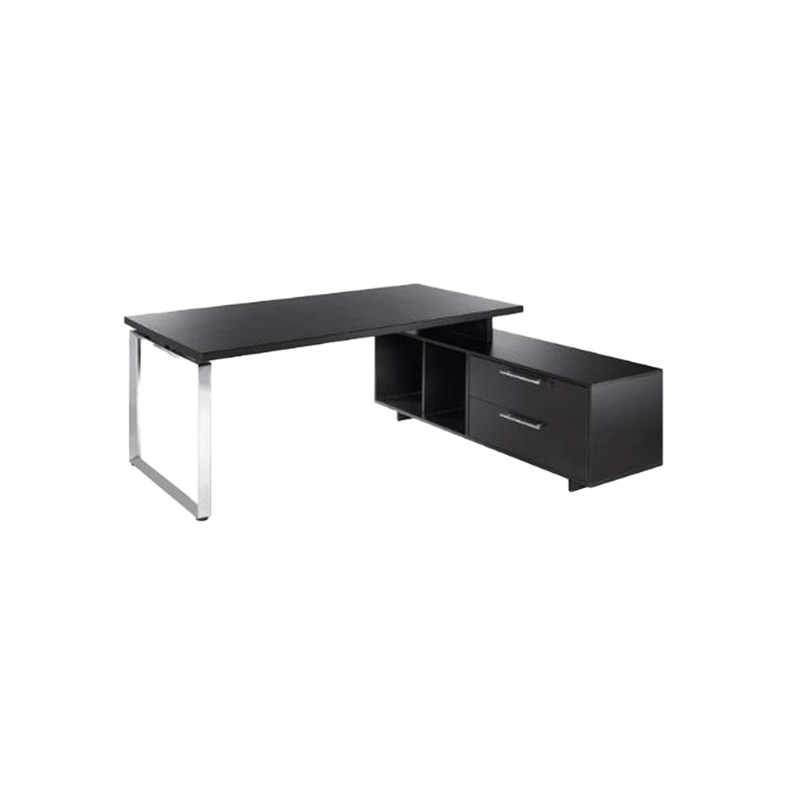 Scrivania con mobile di servizio portante reversibile destro o sinistro. Desktop sp. 38mm con bordo antishock in ABS 2mm. Mobile di servizio portante: struttura sp. 18mm, due ampi cassetti (il primo con serratura, dms. utili 72 x 37,5 x 17h cm) con eleganti e robuste maniglie in metallo, 2 vani a giorno (dms. utili 37,7 x 48,2 x 42,4h cm). Scrivania direzionale L180 x P90 x H74cm, mobile servizio reversibile DX e SX - L160 x P50 x H54cm. Ingombro totale: 195x170xH74cm