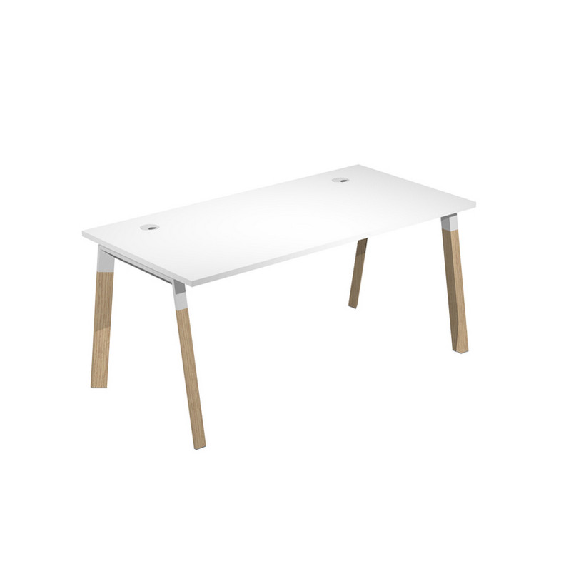 Scrivania con gambe bimateriale in metallo e legno massello. Spessore 25mm. Con due anelli passacavi diam. 80mm. Dimensioni: 140x80x72,5cm. Piano bianco.