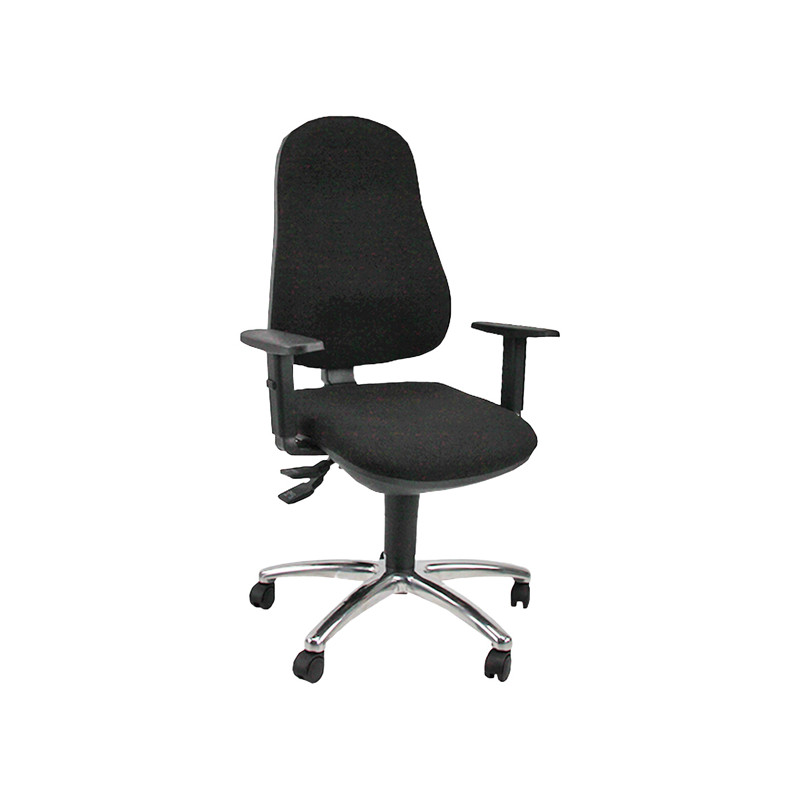 Seduta operativa con schienale alto con sagomature lombari. Meccanismo sincronizzato a 2 leve per la regolazione in altezza del sedile e schienale. Rivestimento in tessuto ECO Eco. Elevazione a gas e base cromata con ruote. Braccioli regolabili.