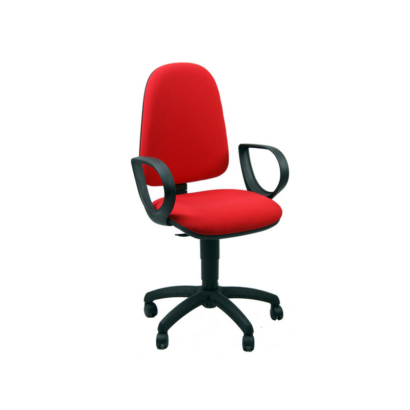 Sedia operativa girevole con base in nylon nero Ø 60cm. Struttura in acciaio nero e ruote in nylon Ø5cm. Imbottitura del sedile e dello schienale in spugna e PPL, rivestimento in acrilico. Braccioli inclusi. Elevazione a gas. Meccanismo a contatto permanente. Schienale regolabile in altezza e profondità. Altezza totale da 98 a 110cm.
