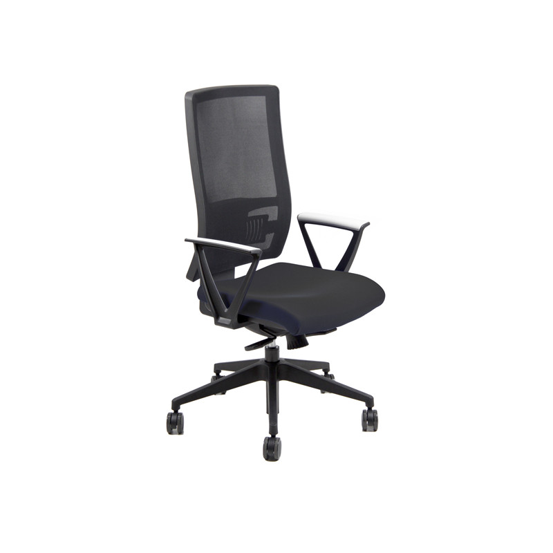 Poltrona con schienale alto in rete nera con supporto lombare. Rivestimento in tessuto Eco con trattamento ignifugo, meccanismo sincronizzato con contatto permanente, elevazione a gas e braccioli in polipropilene.