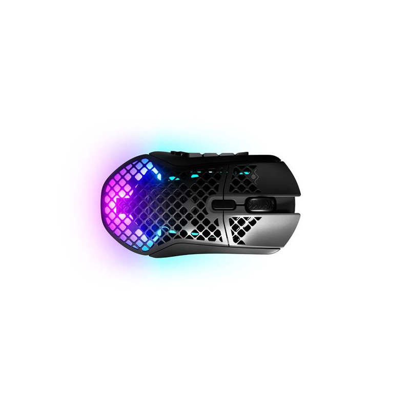 LIGHTning FastThe Aerox 9 is ultralight weight so you can conquer Battle Arenas with speed and Raid longer for more loot.Ultra-Lightweight MMO/MOBA MouseBreak the barriers of demanding MMO and MOBA gaming with an industry-leading, ultra-lightweight 89g Aerox 9 Wireless. Exceptional, sleek comfort with no wrist or arm fatigue meets a library of powerful features to grant you an edge.Holey ShellHoneycomb shell reduces weight by up to 20g while maintaining strength and durability for the most intense gaming sessions.Lightweight BatteryWeighing 6g, our battery is 14g lighter than those in other MMO/MOBA mice, while still giving over 180 hours of battery life.Ultra-Thin PCBRe-engineered electronics that boast a 50% slimmer circuit board while maintaining durability.18 Programmable ButtonsAn arsenal of commands at your fingertips, the optimally placed 12-button side panel, and our tilt-click scroll wheel bring out your favorite abilities and macros, fine-tuning your rotation to perfection.Quantum 2.0 WirelessNext-gen wireless is here. 2.0 Quantum technology transmits data faster than ever before, with industry-leading power efficiency and stability.2.4GHz WirelessLag-free gaming breaks the barrier between you and the screen with an ultra-fast 2.4GHz connection.Bluetooth 5.0Widely compatible Bluetooth 5.0 allows you to connect to a variety of devices, no additional dongle required.180-Hour Battery LifePlay longer, conquer more, charge less. Meticulous engineering extends the battery life of the Aerox 9 Wireless up to a mighty 180 hours, with only 15 minutes of charging for over 40 hours of gameplay and glory. Less waiting, more winner-winner chicken dinners.AquaBarrier ProtectionForget the spills, focus on the win. The IP54-rated AquaBarrier protects the Aerox 9 Wireless from dust, dirt, oil, and debris so you can focus on the game. This barrier shields interior circuitry from virtually all types of environmental damage.TrueMove Air SensorUnrivaled precision with 1-to-1 tracking brings you absolute control. The groundbreaking sensor, co-developed with PixArt, features 18,000 CPI, 400 IPS, 40G acceleration and tilt tracking, making the mouse an extension of your hand to dominate in game.100% PTFE Glide SkatesDesigned with 100% pure PTFE to provide the smoothest swipes and enhanced control for super-fast mouse movements.SteelSeries EngineEasily remap important keys and auto-launch your custom configs for each game you play. Engine offers an arsenal of different customizations, from RGB lighting to adjusting the mouse sensor CPI, and triggering lighting effects with in-game events from GameSense-enabled titles.Detachable USB-C Super Mesh CableOur all-new soft microfiber mesh cable reduces drag to hit that crucial shot. The USB-C connection enables you to customize the mouse with aftermarket cable options.Brilliant PrismSync LightingRedesigned lighting provides 3 zones of 16.8 million beautifully crisp colors that can synchronize with other SteelSeries products. Choose from millions of colors and effects from reactive lighting to interactive light shows that bring RGB to the next level.Grip Styles & DimensionsThe right-handed shape of the Aerox 9 Wireless is designed for a player’s highest demand for lightweight precision and comfort.
