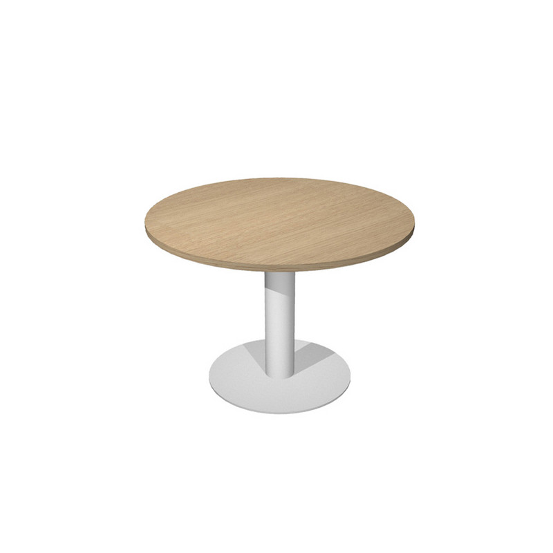 Tavolo riunione tondo Ø120 x H73cm (6 posti). In materiale melaminico classe E1 con finitura antigraffio e antiriflesso. Piani spessore 25mm gamba in metallo Ø8cm con base Ø50cm. Altezza fissa.