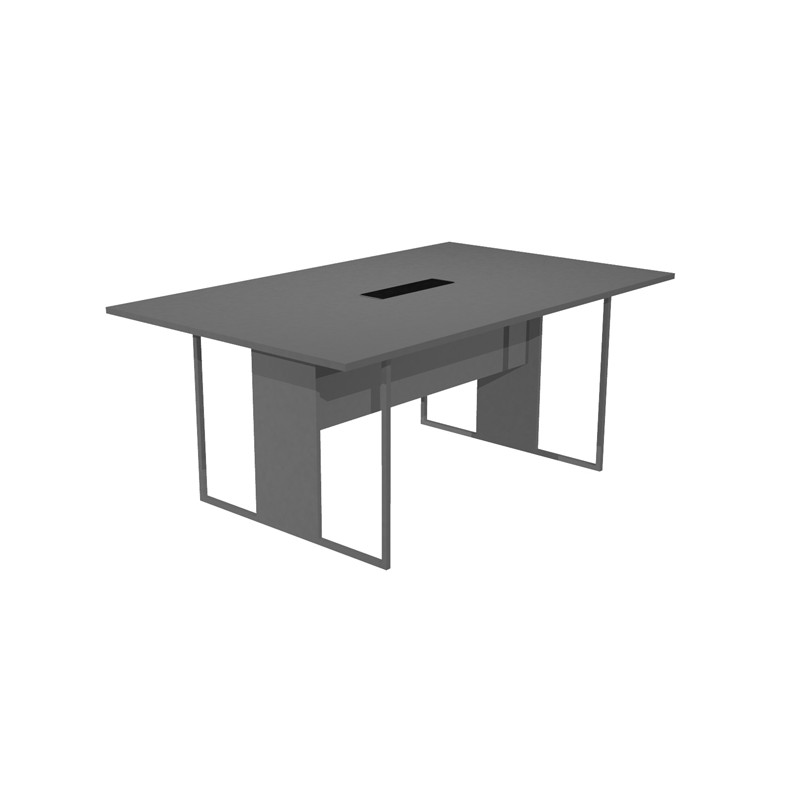 Desktop in melaminico bilaminato sp.22mm. 2 modesty panel strutturali in melaminico bilaminato H35cm (sp.18mm). Gambe ad anello in metallo a sezione quadrata 20x200mm verniciate a polveri epossidiche complete di piedini regolabili in altezza e montante strutturale in melaminico bilaminato di larghezza 30cm (spessore 18mm). Larghezza gamba 90cm. Tavolo riunione con top access L180xP110xH74,4cm