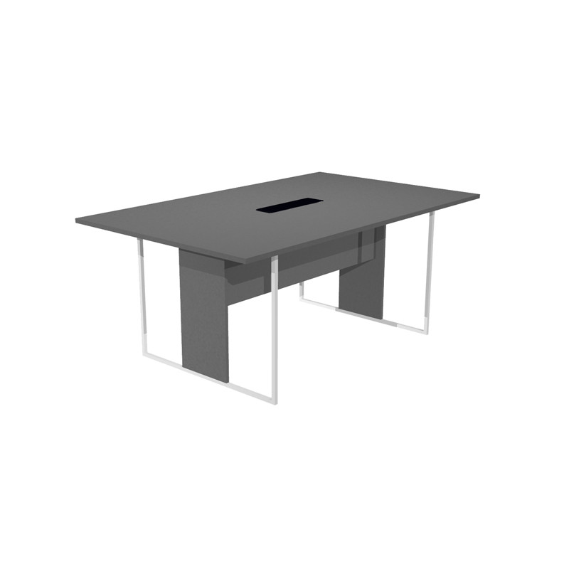 Desktop in melaminico bilaminato sp.22mm. 2 modesty panel strutturali in melaminico bilaminato H35cm (sp.18mm). Gambe ad anello in metallo a sezione quadrata 20x200mm verniciate a polveri epossidiche complete di piedini regolabili in altezza e montante strutturale in melaminico bilaminato di larghezza 30cm (spessore 18mm). Larghezza gamba 90cm. Tavolo riunione con top access L180xP110xH74,4cm