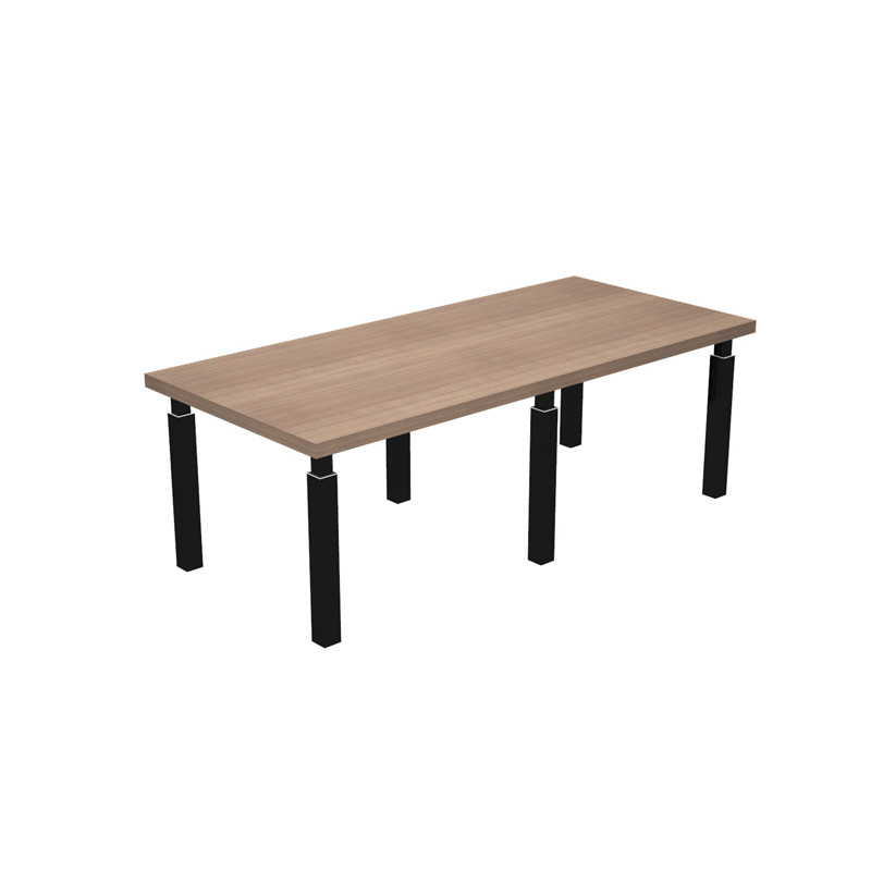 Piano e fianchi sp. 38 mm con bordo antiurto in ABS 3 mm. Piedini regolabili in altezza. Traversa centrale in melaminico spessore 18 mm. Tavolo riunione L220xP100xH76,2cm Gambe nero opaco