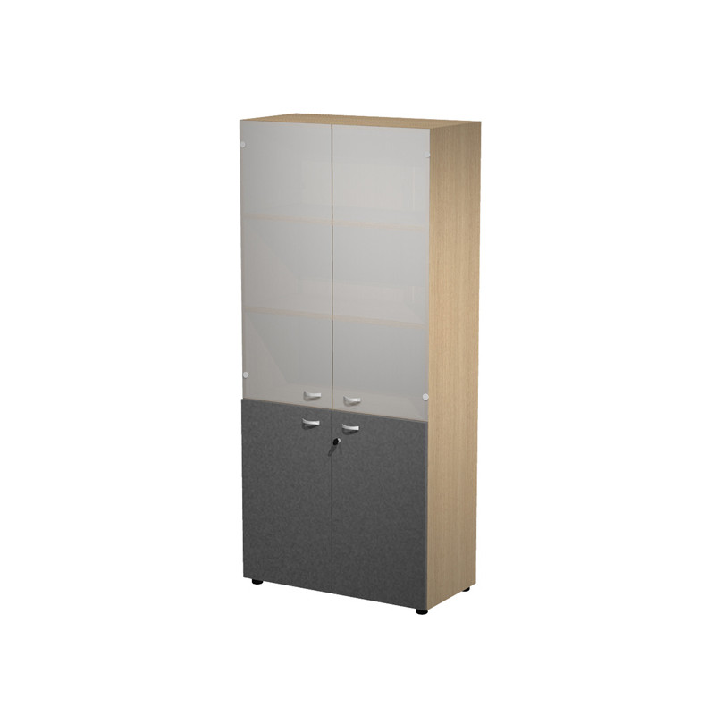 Armadi con ante dotate di serratura. Top sp. 18mm, struttura spessore 18mm, ripiani riposizionabili spessore 25mm. Rifiniti posteriormente nello stesso colore della struttura in modo da poter essere riutilizzate come pareti divisorie. Piedini regolabili in altezza. Ripiani riposizionabilli. Profondità utile dei ripiani 42,5cm. Ante color antracite. Armadio con ante superiori in vetro+ante inferiori in melaminico con serratura 1 ripiano fisso+3 riposizionabili L90 x P45 x H200cm