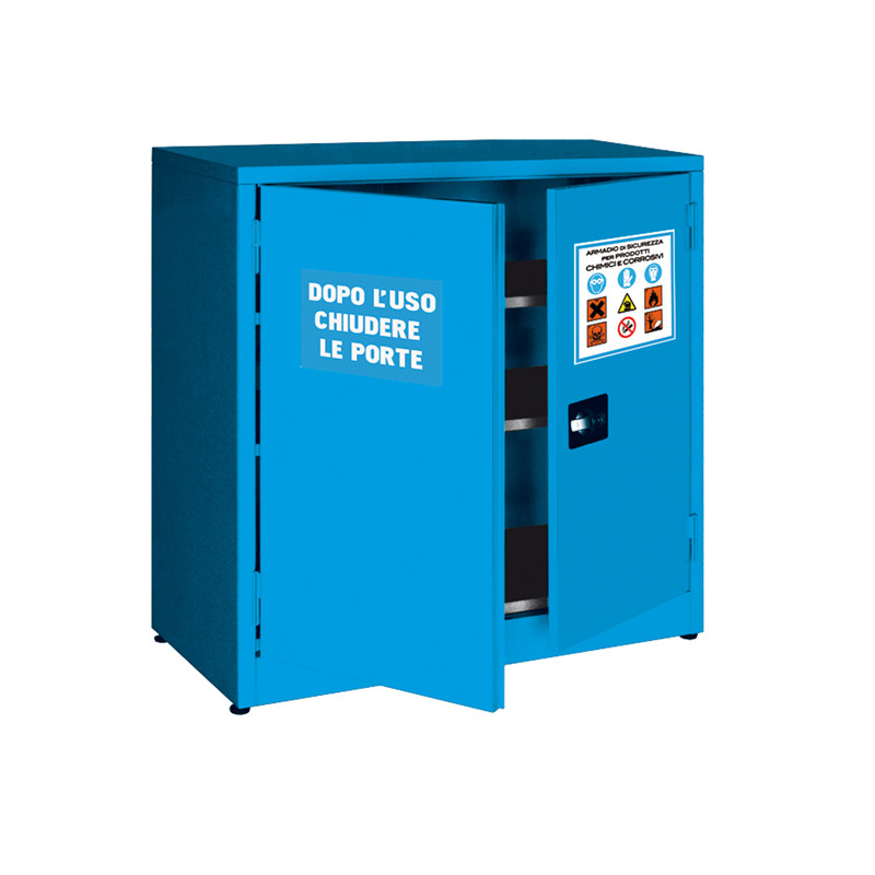 Armadio di sicurezza componibile per lo stoccaggio di liquidi chimici, realizzato in lamiera di acciaio al carbonio P02 spessore 10/10, pre-trattato con fosfosgrassaggio in tunnel ad alte temperature. Verniciatura con innovativo e speciale materiale termoplastico a base polietilene che permette un rivestimento di alto spessore adatto alla resistenza agli agenti chimici corrosivi, BLU RAL5015, e cottura in galleria termica 180°.Dotato di ripiani di contenimento regolabili in altezza e vasca di raccolta a tenuta stagna sul fondo con guarnizioni in gomma, n. 2 griglie di areazione laterali e una posizionata sul tetto con sistema tagliafiamma appositamente studiate per il ricircolo dell’aria o per l’aspirazione forzata. Spigolo arrotondato, robuste cerniere in zama spessore 6 mm, cavo di messa a terra, piedini regolabili, serratura ergonomica in plastica e alluminio con doppia chiave completa di chiusura ad asta con carter copriaste antimanomissione. Forniti smontati in un robusto imballo su misura, posizionato su bancale singolo. Il montaggio è rapido e semplice, con manuale istruzioni contenuto in ogni kit. Costruito a regola d’arte in risposta alle normative vigenti in materia di protezione ambientale e prevenzione all’inquinamento. Etichettatura di sicurezza come disposizioni da normativa vigente