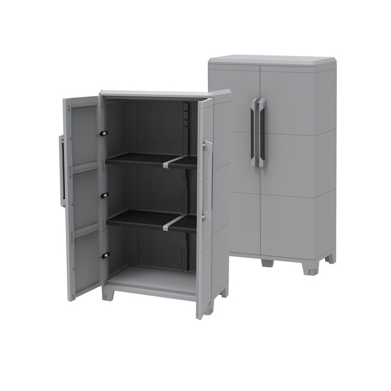 Armadio in colore grigio con struttura a moduli interconnessi e sovrapposti che garantiscono solidità e robustezza. Fondo rinforzato con 6 piedi di cui i due anteriori regolabili in altezza. Ripiani interni modulari con portata massima di 40Kg a ripiano. Ideale anche per ambiente esterno (resiste alle temperature da +40° a -5°) e ai raggi UV. Cerniere in metallo resistenti antivento, anta a battente, ripiano inclinato (IP43 rain proof), labirinti antipioggia. La caratteristica innovativa di queto armadio è che può essere ampliato o ridotto in base alle proprie esigenze, senza alcun limite se non quello dello spazio a disposizione. Armadio modello Transforming Modular 3 dimensioni: L78 x P43,6 x H143cm.