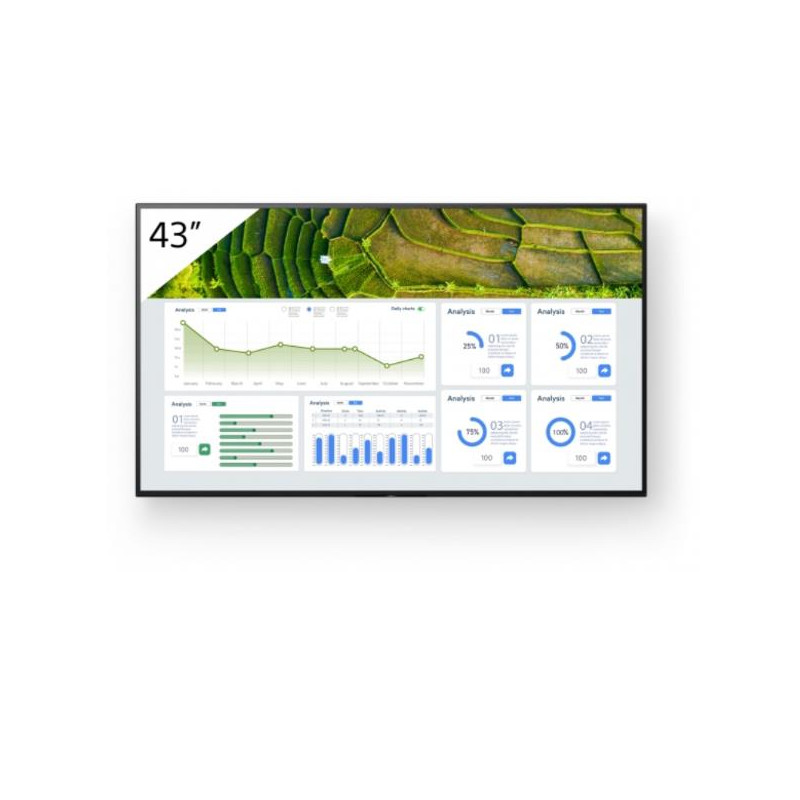 FW-43BZ30L da 43' offre un'ampia luminosità dello schermo di 440 nit. Le avanzate tecnologie di elaborazione delle immagini Sony ti assicurano che i contenuti appaiano al meglio. L'angolo di visualizzazione ultra ampio del pannello garantisce che tutti gli utenti della stanza possano godere di immagini nitide e luminose ovunque si trovino.