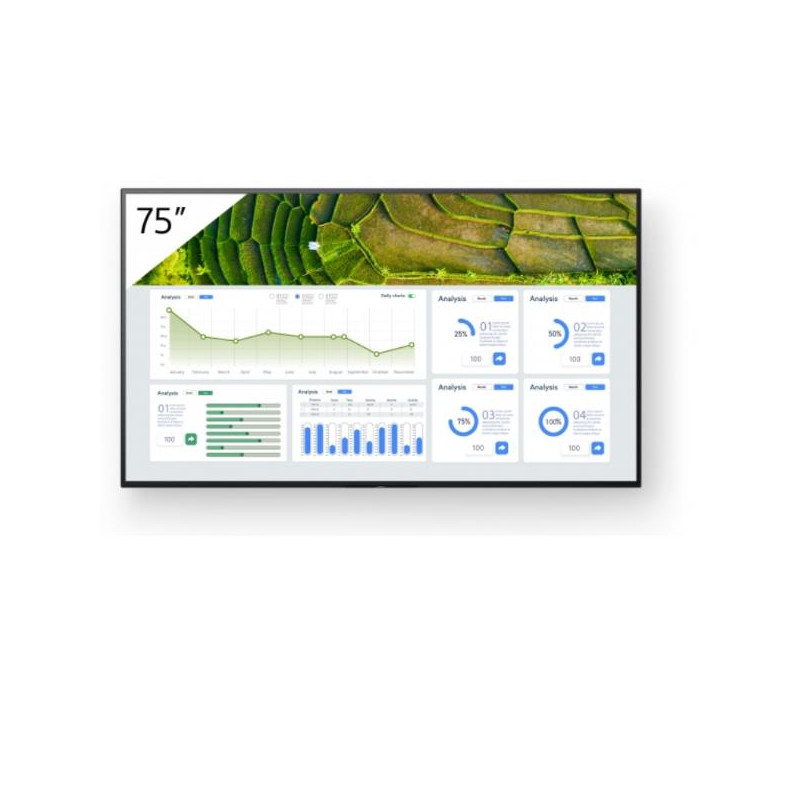 FW-75BZ30L da 75' offre un'ampia luminosità dello schermo di 440 nit. Le avanzate tecnologie di elaborazione delle immagini Sony ti assicurano che i contenuti appaiano al meglio. L'angolo di visualizzazione ultra ampio del pannello garantisce che tutti gli utenti della stanza possano godere di immagini nitide e luminose ovunque si trovino.